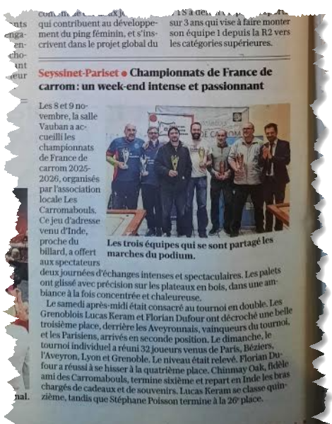 Du côté de Grenoble, plus précisément à Seyssinet-Pariset, le 8 et 9 novembre dernier avait lieu le second tournoi de pôle du Championnat de France de Carrom 2025-26.